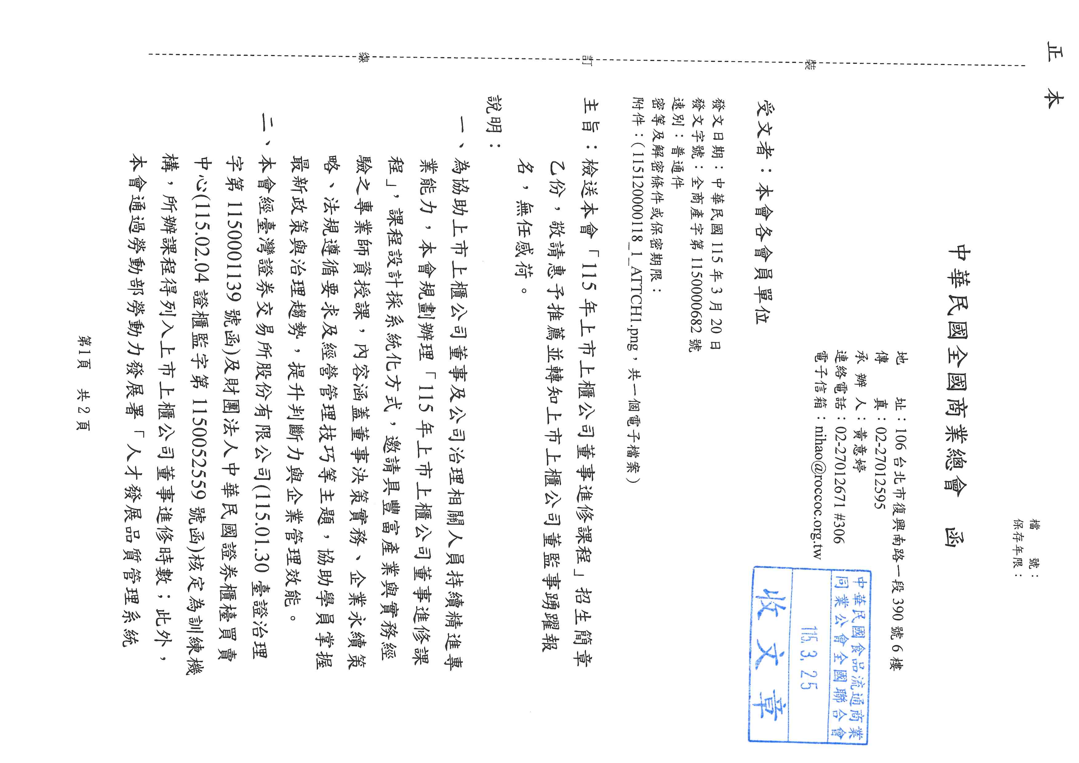 檢送本會「115年上市上櫃公司董事進修課程」招生簡章乙份,敬請惠予推薦並轉知上市上櫃公司董監事踴躍報名,無任感荷。 2026-03-25 詳函文,也可點選連結>>「115年上市上櫃公司董事進修課程」 回上頁