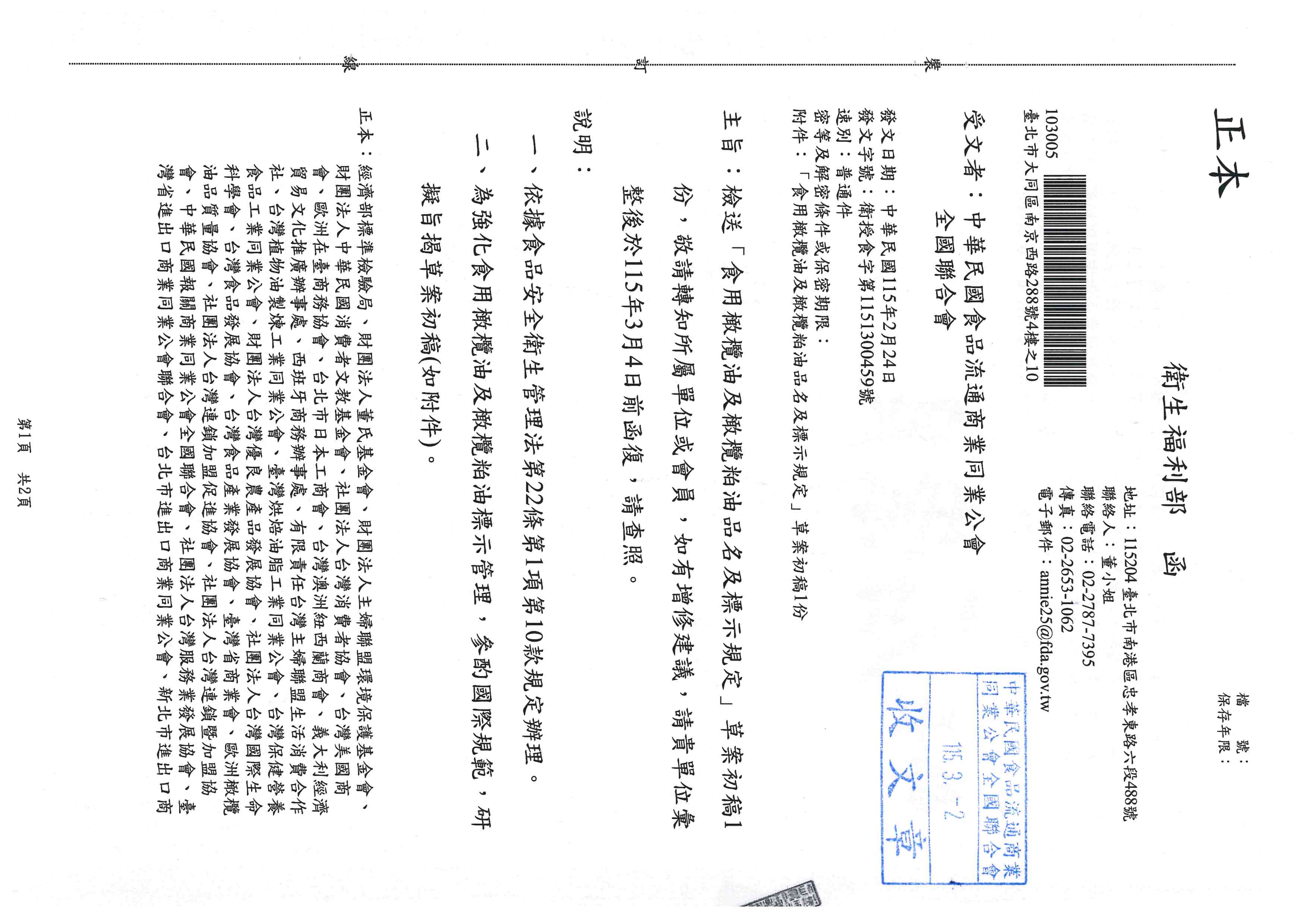 檢送「食用橄欖油及橄欖粕油品名及標示規定」草案初稿1份,敬請轉知所屬單位或會員,如有 增修建議,請貴單位彙整後於115年3月4日前函覆, 請查照。 2026-03-02 來函詳附件。若有增修建議,建請115年3月3日下班前回覆。 回上頁