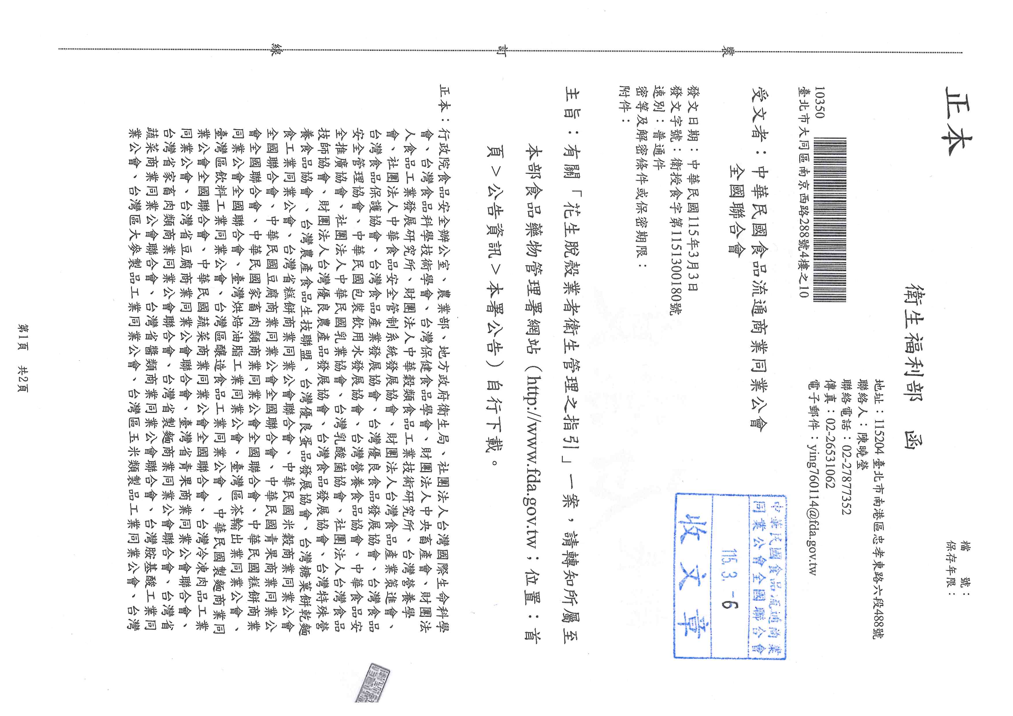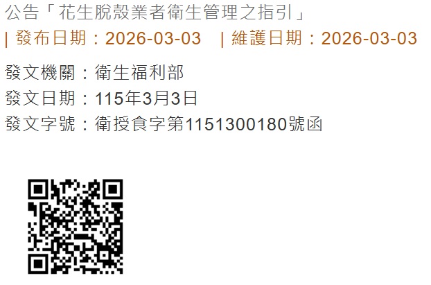 有關「花生脫殼業者衛生管理之指引」一案,請轉知所屬至本部食品藥物管理署網站自行下載。