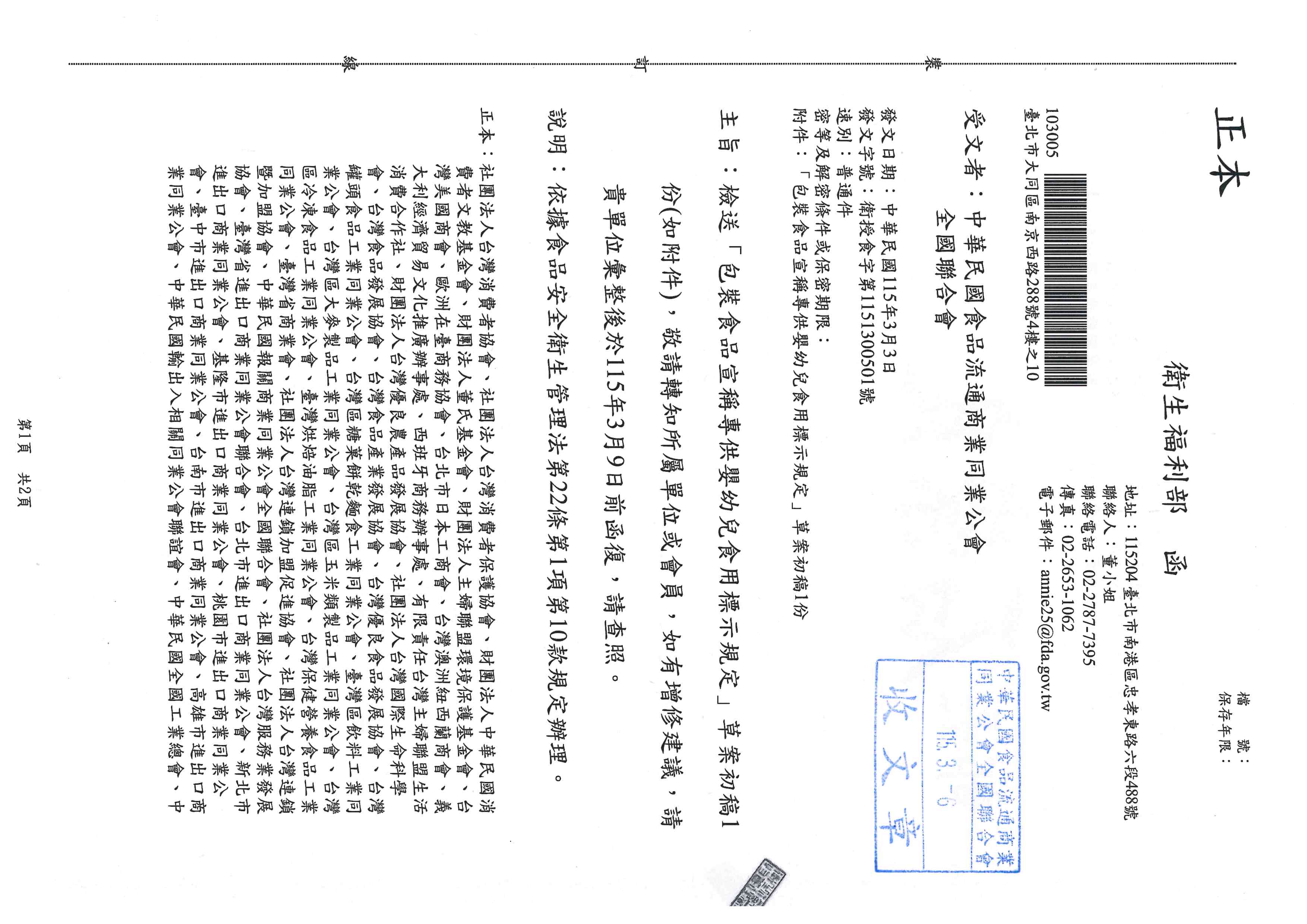 檢送「包裝食品宣稱專供嬰幼兒食用標示規定」草案初稿1份(如附件),敬請轉知所屬單位或會員,如有增修建議,請 貴單位彙整後於115年3月9日前函復,請查照。 2026-03-06 詳函文說明,若有增修建議,請3/9中午前提供。 回上頁