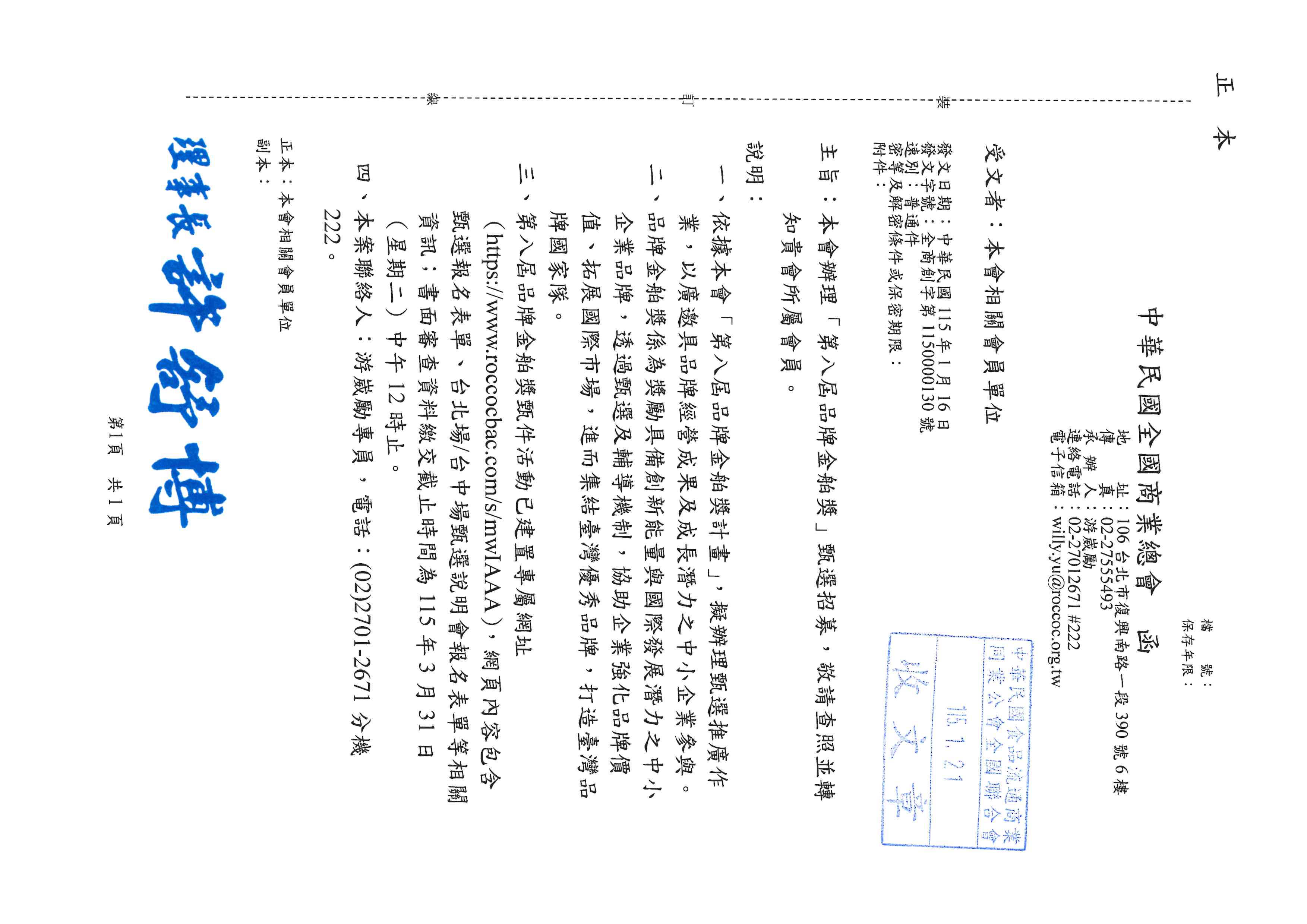 本會辦理「第八屆品牌金舶獎」甄選招募,敬請查照並轉知貴會所屬會員。