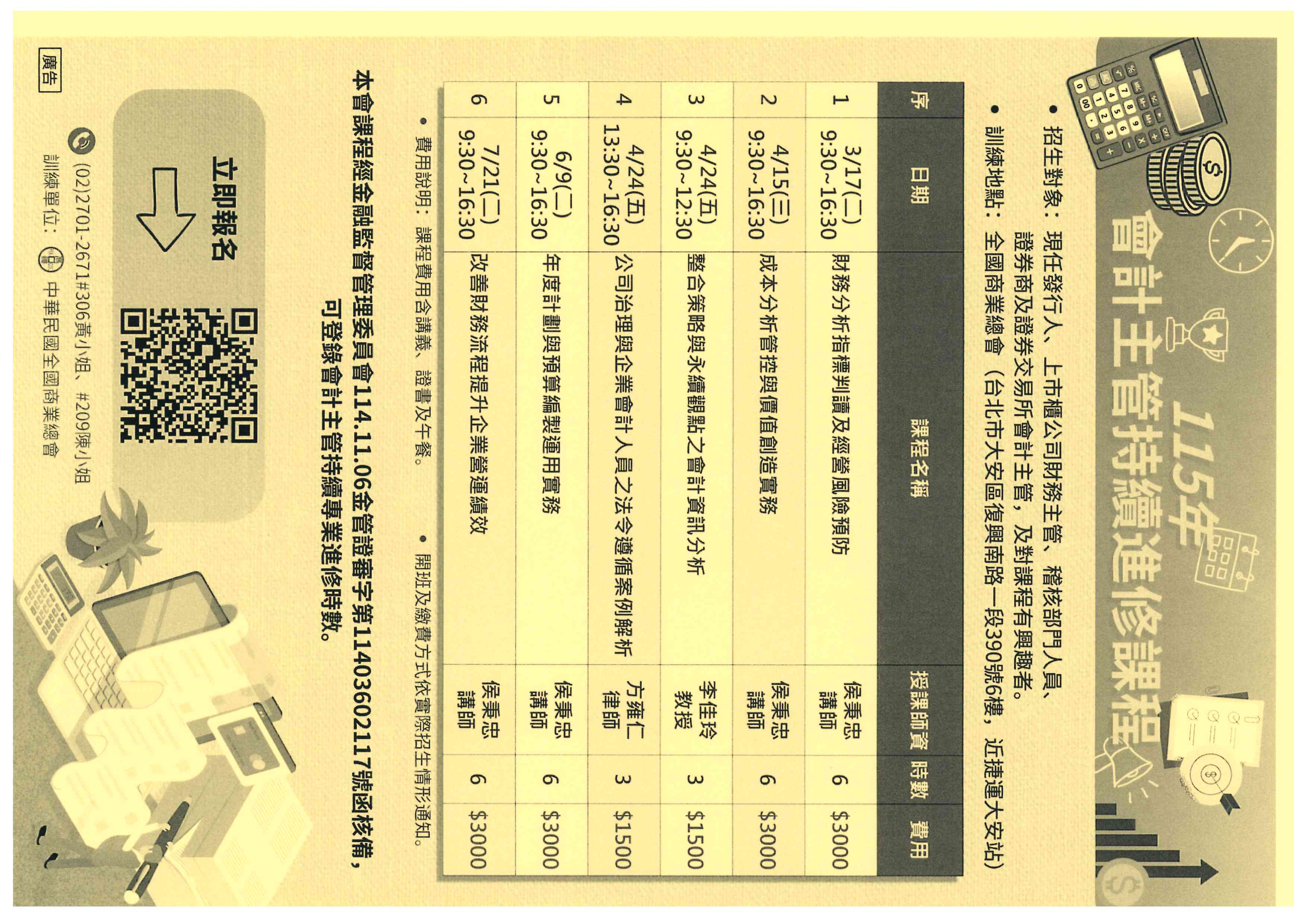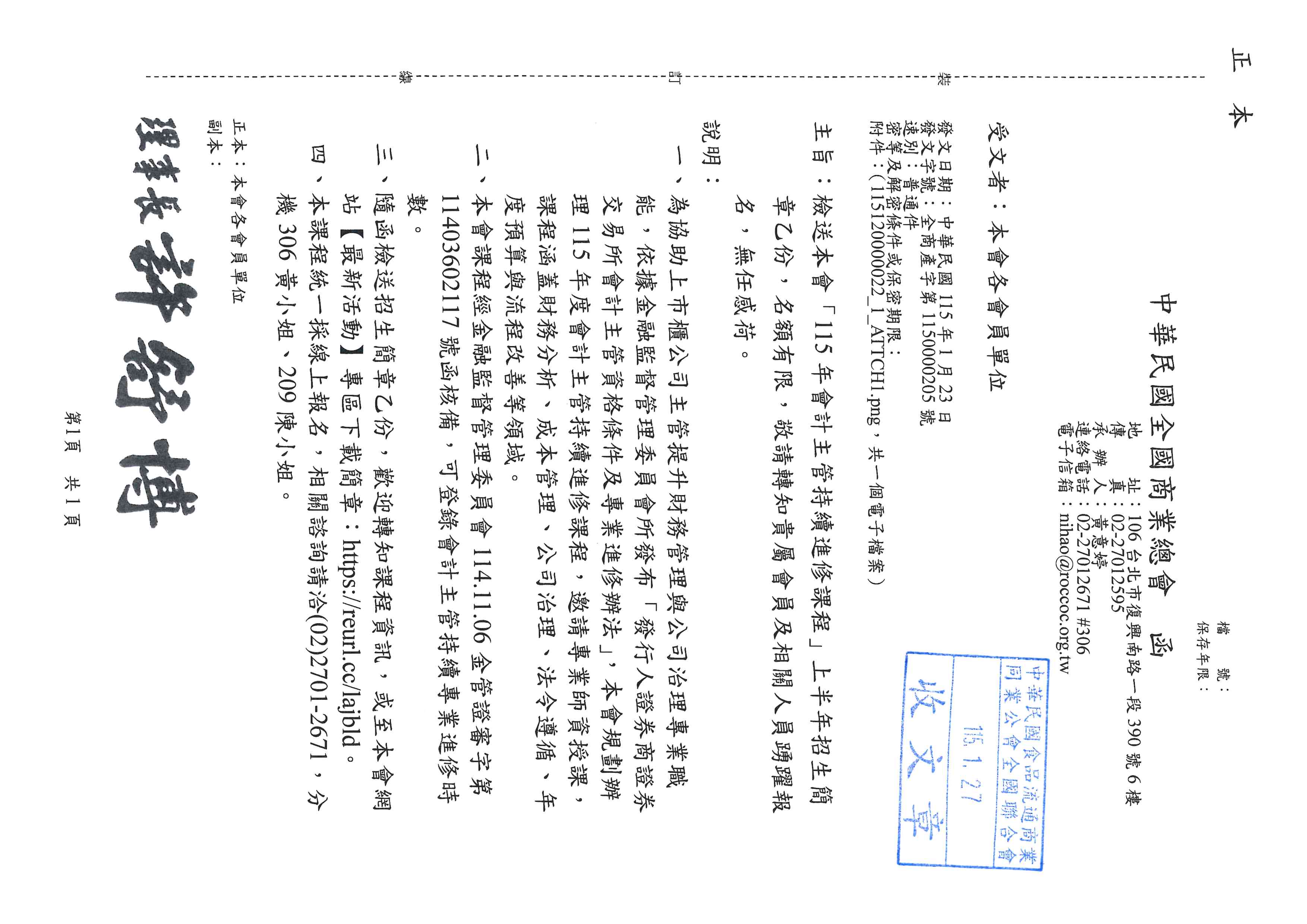 檢送本會「115年會計主管持續進修課程」上半年招生簡章乙份,名額有限,敬請轉知 貴屬會員及相關人員踴躍報名,無任感荷。