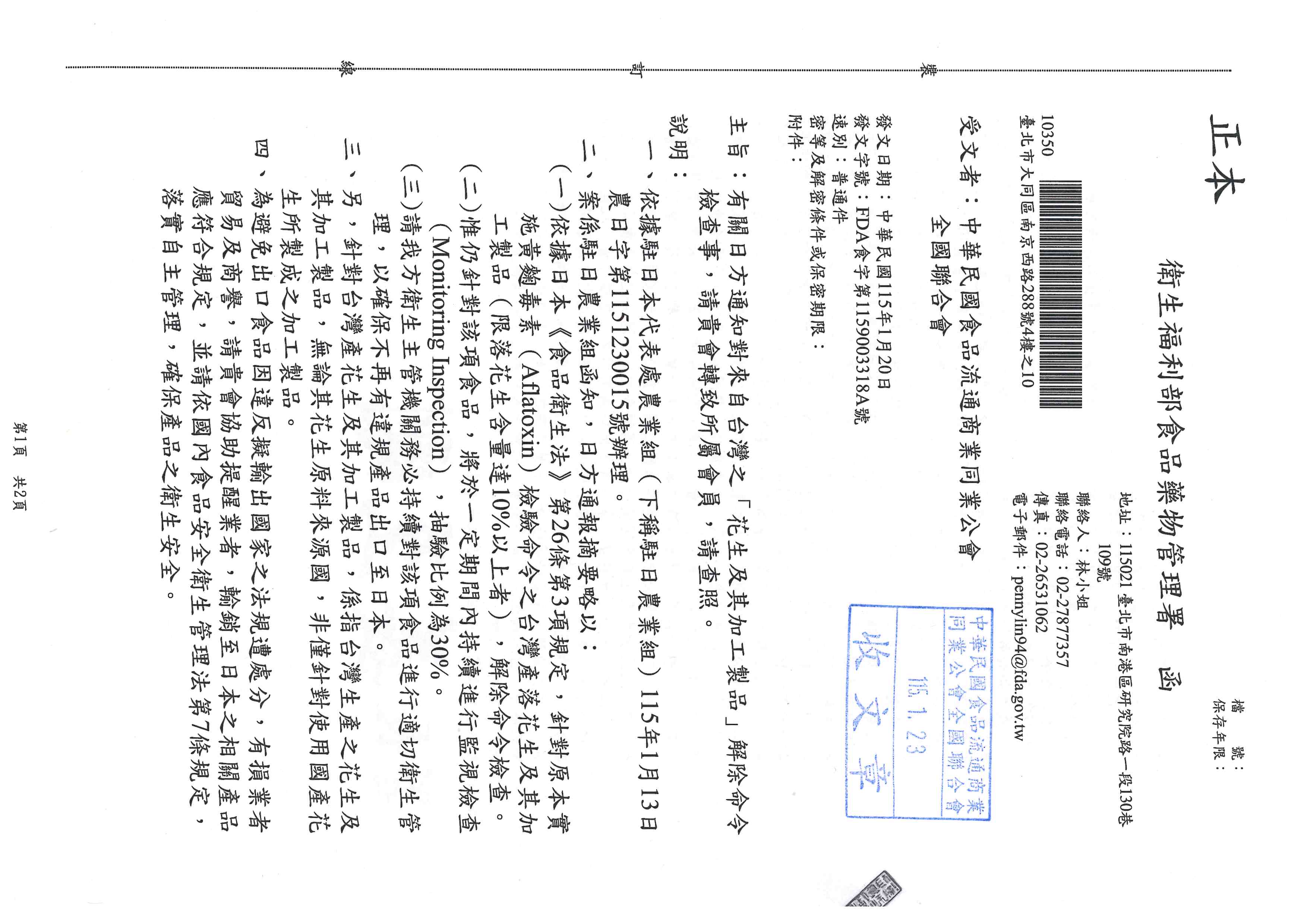 有關日方通知對來自台灣之「花生及其加工製品」解除命令檢查事,請貴會轉致所屬會員,請查照。