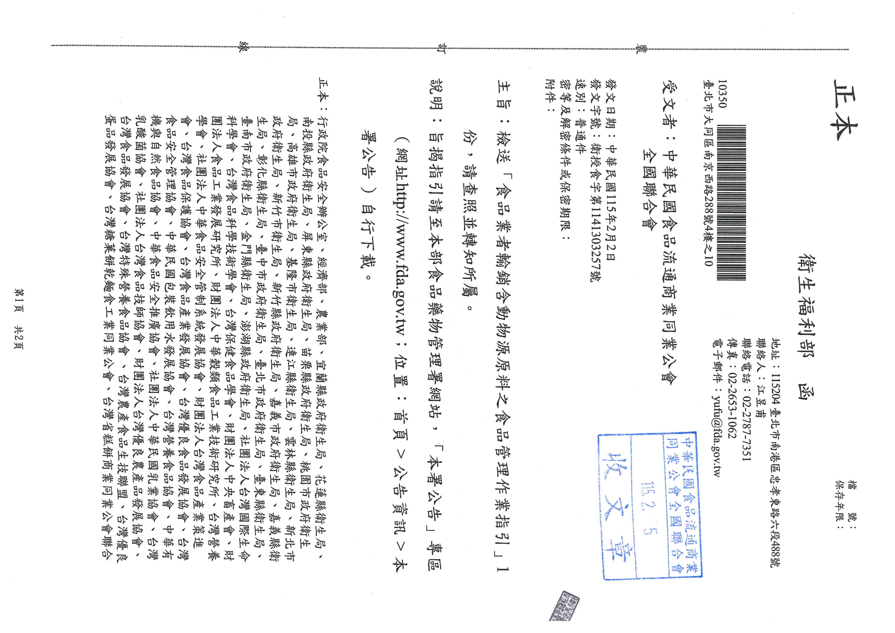 檢送「食品業者輸銷含動物源原料之食品管理作業指引」1份,請查照並轉知所屬。