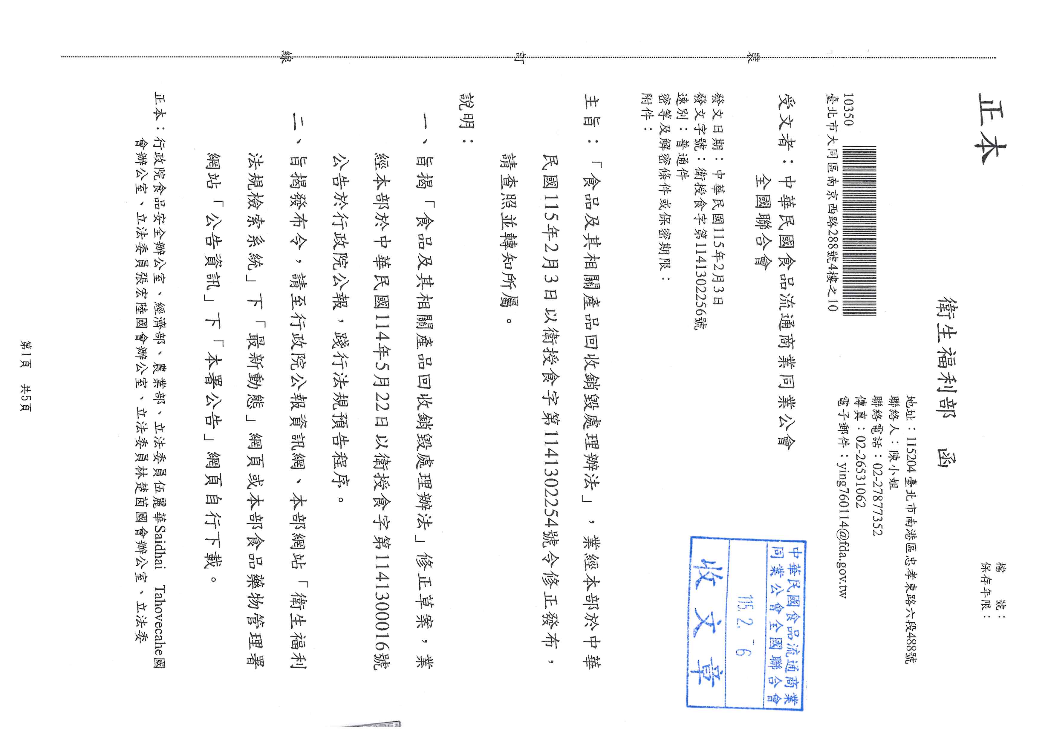 「食品及其相關產品回收銷毀處理辦法」,業經本部於中華民國115年2月3日以衛授食字第1141302254號令修正發布,請查照並轉知所屬。